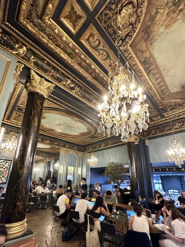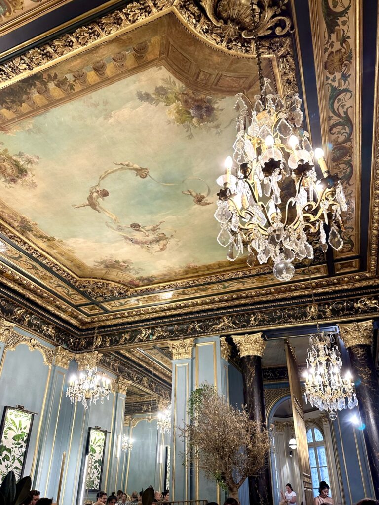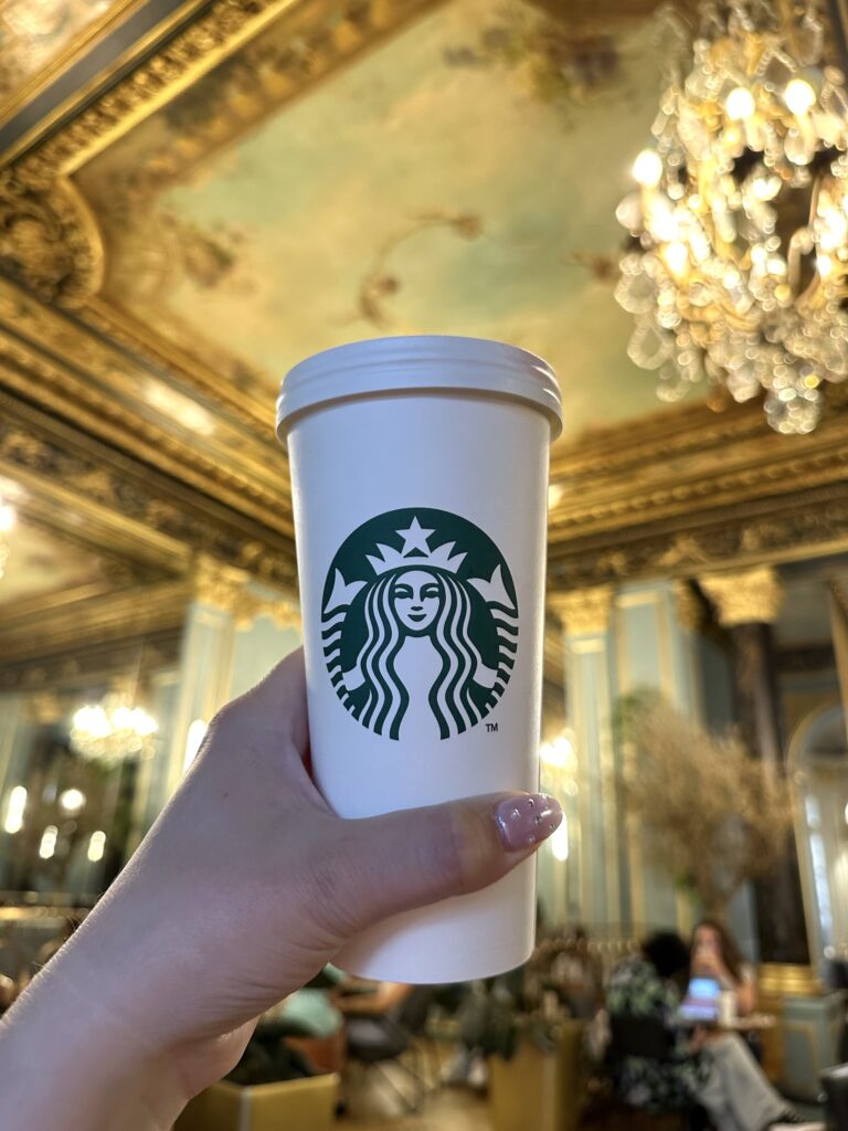 I have never been afraid or ashamed to admit I am the epitome of a “basic white b*tch”, and this includes loving Starbucks. A vanilla sweet cream cold brew, choco chip frap, raspberry (rip raspberry syrup) white choco mocha, a PSL in the fall… there is not much on their menu I don’t drink! As a Starbucks gold card holder (they mailed it to you back in like 2012?!) I have been sippin’ Starbs for a very long time, and one of my all time, top favourite, most ordered drink was/is the cool lime refresher. WHYYYY Starbucks took this refreshing, zesty, drink off the menu in North America (US in 2018, Canada in 2019) is a mystery to me, and I think about that drink at least once a week. However, to my delight on my solo trip in 2020, a year sans cool lime, I found out that Europe still had it! All over! At every location! And it was still perfection! When I tell you I drank 2 cool lime refreshers almost everyday on that trip… anyway. All this back story to say: making it into a Starbucks daily when I’m in Europe for me is… not like top priority, but it’s not not a top priority, ya know?! And while being in a foreign land, looking to kill my cool lime crave, I do a lot of maps-ing to find a café. Or, like, the 6 closest to my hotel. So to my delight, when I found out Paris has one of the most dreamy, gorgeous, stunning Starbucks cafés in the world: 3 Boulevard des Capucines, I knew I had to go see it for myself. When I say this is the most romantic, opulent, palace-like place to drink your fave drink I’m not kidding. It is a restored 17th-century building showcasing ornate 19th-century murals, gold gilded moldings, sparkly chandeliers, and black marble columns. It feels very reminiscent of Versailles with walls of mirrors, but is also giving major Bridgerton vibes. Unlike the usual small Parisian cafés, there is lots of seating, with two levels and lots of big tables, perfect for work or study, and small two tops for a more classic coffee shop feel. There is nothing more delightful than an afternoon coffee stop, in Paris, in the “most beautiful café” in the world.