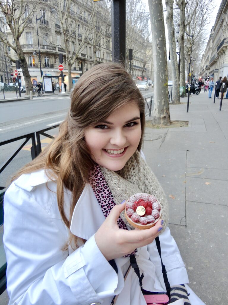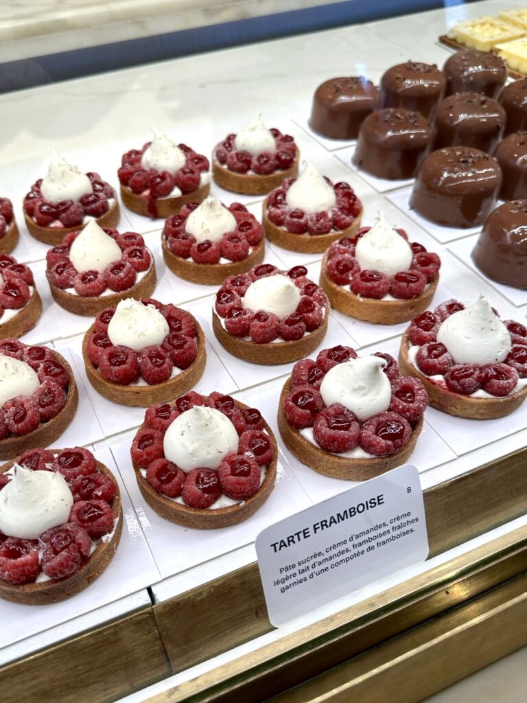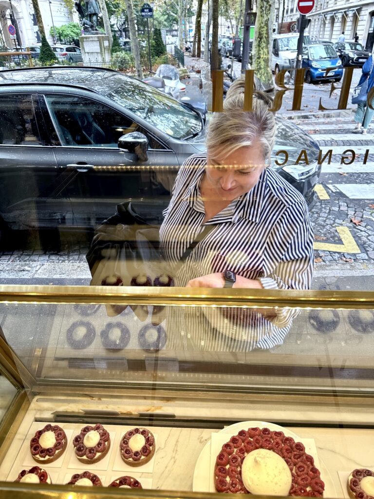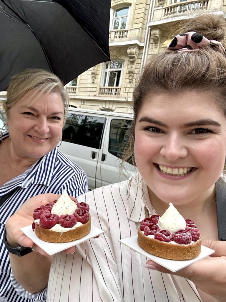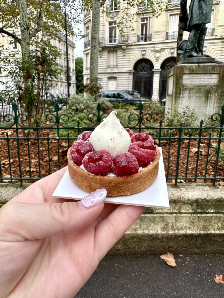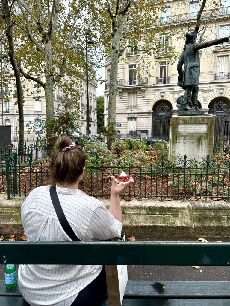 Speaking of girl dinner, this delightful Parisian activity also features food and another classic French pastry! My mom and I have had the most drool-worthy, delectable, delicious, dreamy raspberry tarts in Paris, so we are always on the look out for a new bakery showcasing our favourite treat. On our first trip together we excitedly wandered into Boulangerie Gosselin when the gorgeous raspberry tart in the window beckoned us in. Said raspberry tart was purchased, a bench (albeit on the street, but we upgraded our location for the next tart treat a decade later!) was sat upon, some very 2013 vibe photos of me holding said tart were taken and then lives were changed with the first bite of that oh so tasty tart. Regrets on sharing one tart and not each having our own were big, but the lesson was learned and two tarts have been purchased ever since. Because really, I would bet no one has ever had a bad raspberry tart, especially not in Paris. In 2023 our first day in the city was dreary on and off rain, so where better to seek shelter than in a warm, fresh bread-scented, French bakery? My mom really wanted to find a raspberry tart the first day back in the city of love, so off we went. On our stroll we saw La Pâtisserie Cyril Lignac on the kitty corner of Place Rochambeau and voilà, raspberry tartS acquired! In classic, tiny, cute European architecture fashion, the bakery didn’t have any seating, but Place Rochambeau, a tiny triangle of grass with one bench welcomed us. So, just a little deja-vu-ey… we sat on a bench, took some photos (I have not yet mastered the nonchalant “who me? just holding a delish pastry in Paris” cool-girl pic… maybe on my next trip?), and were once again transported to raspberry cream heaven. Moral of this story… be in Paris, find a raspberry tart, don’t share it, sit on a bench, take photos, and have your life forever changed with the most delightful activity: French pastries savoured in a Parisian park.