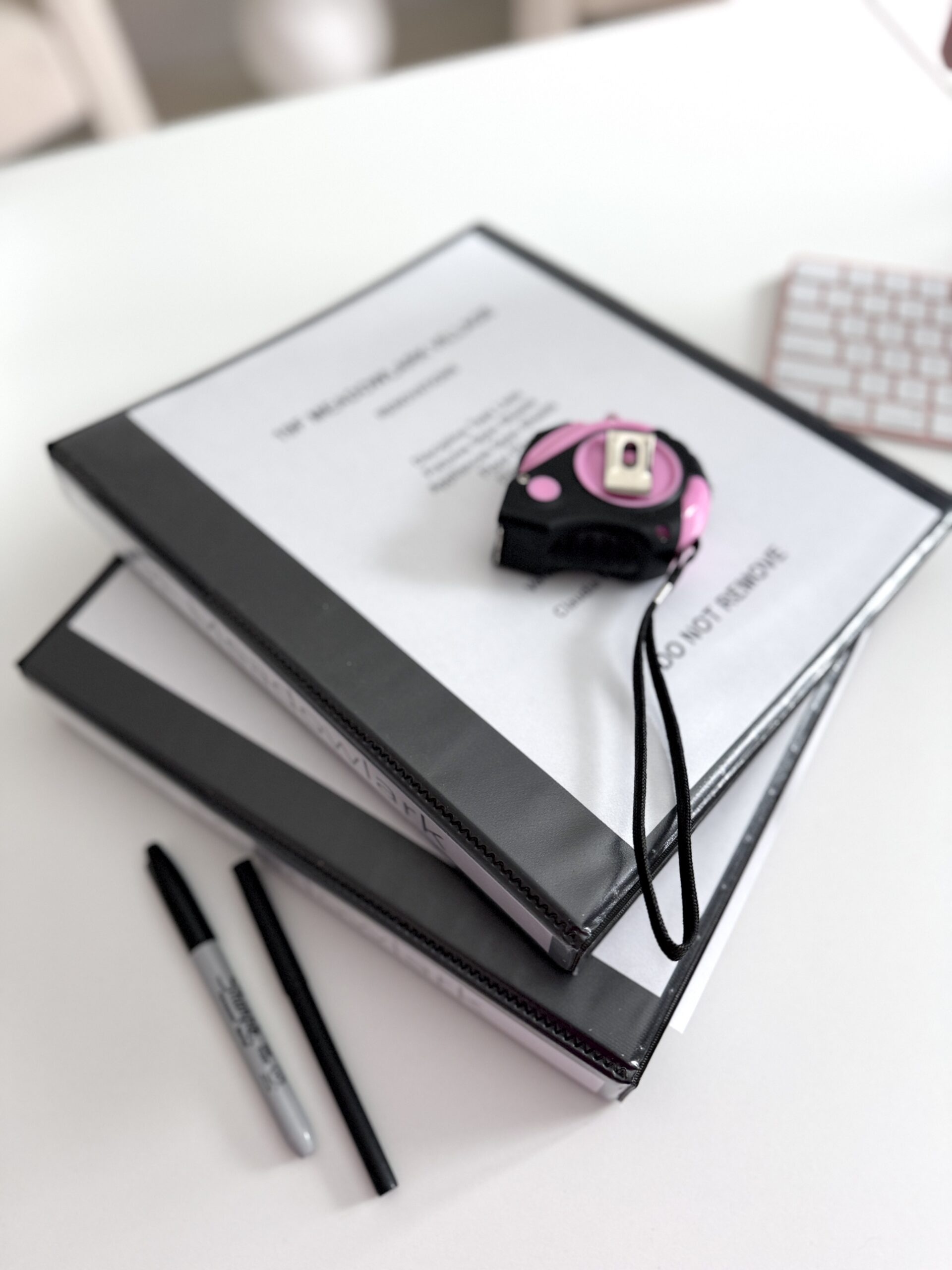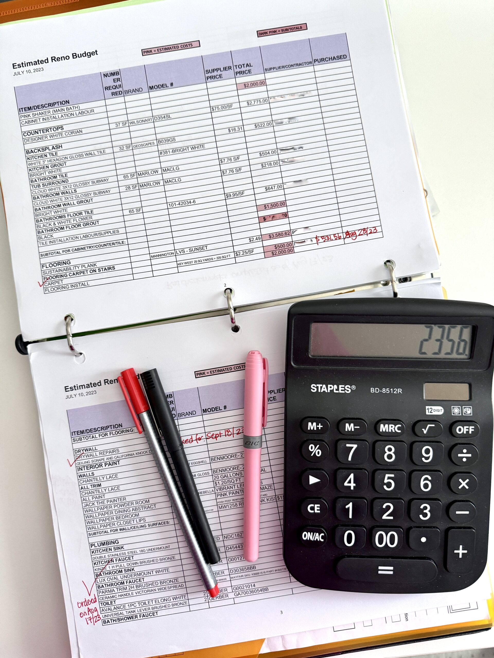 We love a binder (we talked about our reno binder in this post too!) especially for our renovation projects. Each project gets its own binder, there are so many pros to having a physical binder for a reno, and being able to put pen to paper. Not only does a binder give you a tangible space to store any paper you collect over the project; (and trust me, there is lots!!) spec/tear sheets, receipts, business cards, measurements, fabric samples, timelines, the all important budget, sketched out ideas. etc. and storing all this info in one binder means its always right at your fingertips. This is especially helpful when it comes to communicating plans, designs and ideas to various people you’re working with: sales people, contractors, trades etc. A binder is also an easy way to take paper to and from the job site! And that little pocket in the front is great for holding many different things… tiles, paint samples, wallpaper samples… We love our binder!!
