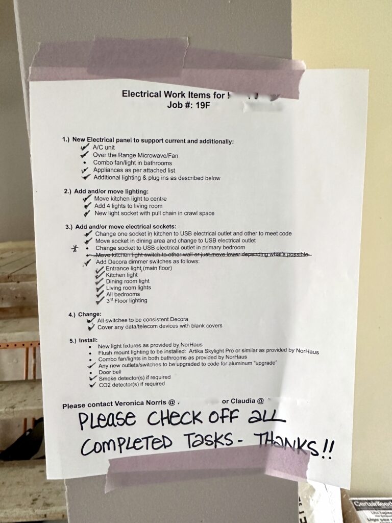 Tradespeople and contractors can be inconsistent from project to project, even if you repeatedly use the same company for something like heating or plumbing, the person they send might be different! So being on site and meeting all the tradespeople/contractors on their first day with you is important. You can talk to them and explain your plan in person, ask questions you have, confirm how long they expect to be on site, and make sure everyone is on the same page with what is happening/needs to be accomplished. We create checklists for them that we go over together, and then that checklist gets left at site, this is a helpful reminder and visual to keep everyone on track as well! This is especially important for hard finishings that are expensive to change if mistakes are made: tile installation, light fixture placements, wallpaper, cabinet install, flooring and don’t forget the electrical!Haus Tip: