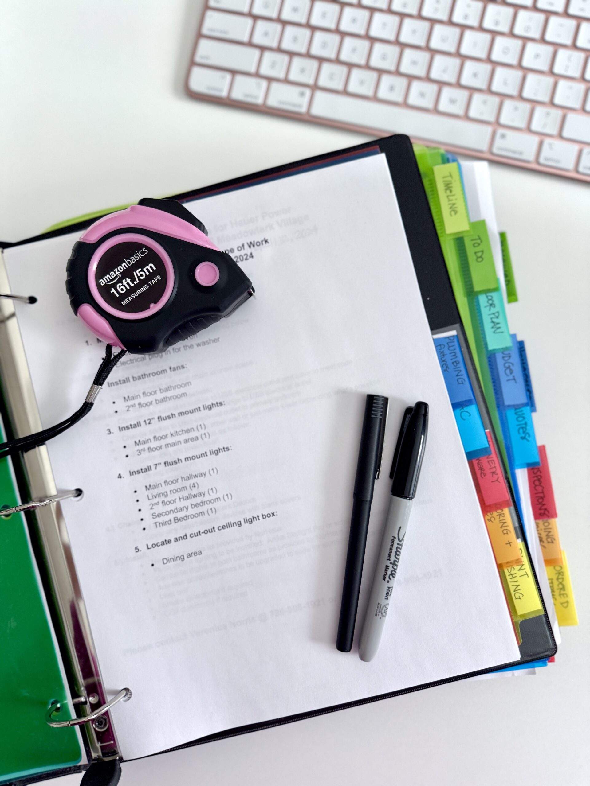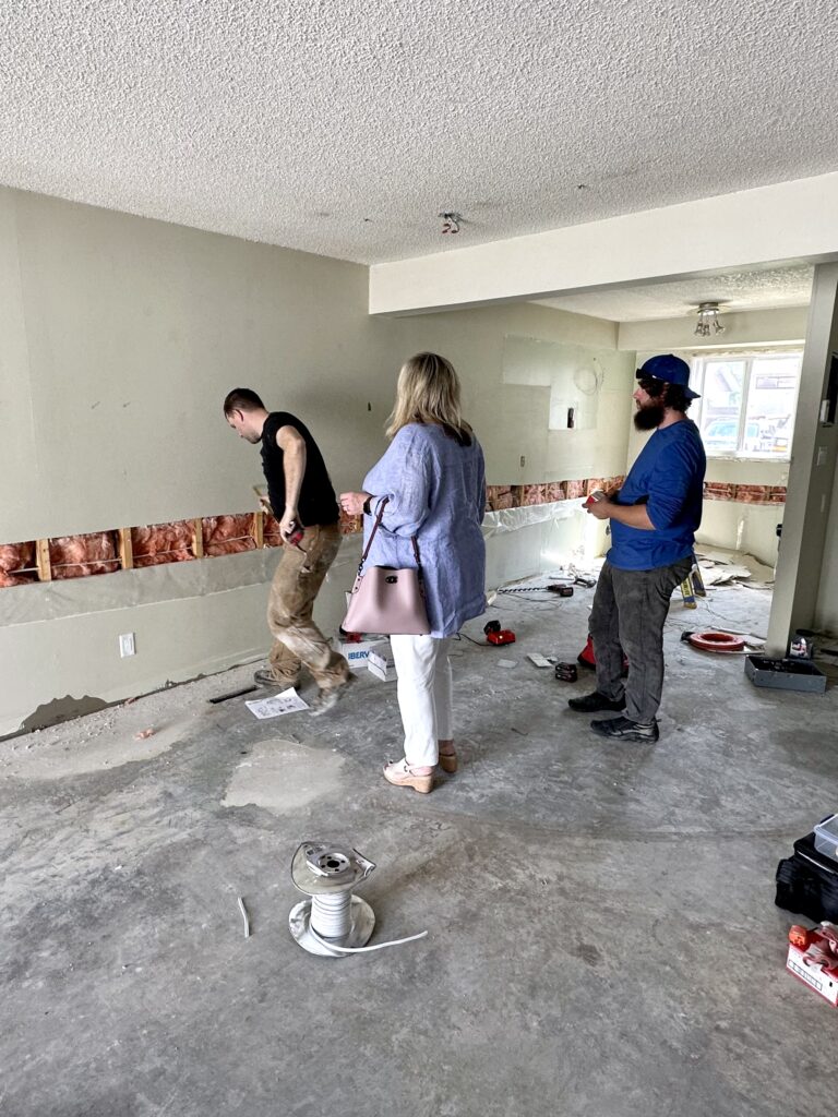We keep a daily and weekly written record of what trades were at our project, documenting when, and what they did. This may seem silly, but it is really so helpful to keep everyone on track and accountable, but also great to have if there is ever a dispute with a trade, you will have a record. We have our on-site check list, and then a personal list of who/what/when in our, you guessed it, binder!! We always think, oh I’ll remember this, but trust us, in a reno project the days and weeks blend together. We also take progress photos every time we go to site, both for our own records/to see where were at, but this is also visual “proof” if something has gone wrong and you have to have a hard convo with a contractor. Keep these photos in a labeled folder in your photos app for easy reference!