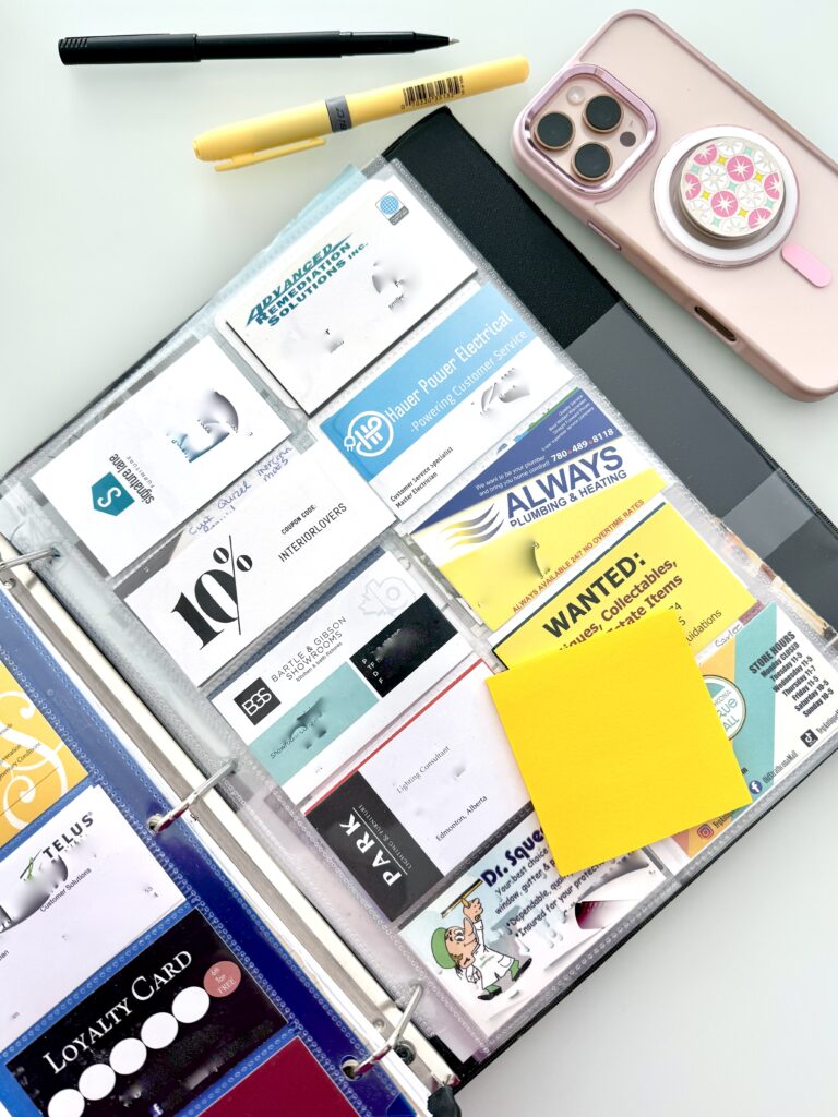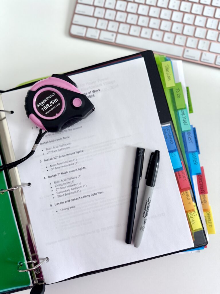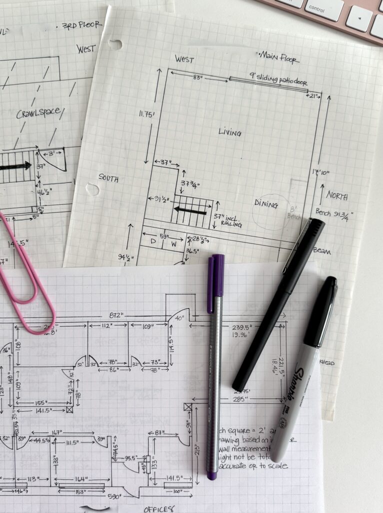 We are old school and love our paper and pens! Sure, you can use your phone’s notes app or other digital tools to store info, but a binder is tried and true. Having things written down or sketched out, categorized by tabs, on a movable sticky note, or even samples from other items you’ve already picked or want to use can be super helpful when communicating your design ideas to a sales person! A binder also gives you a space to store paper you receive while shopping; spec/tear sheets, receipts, business cards, measurements, fabric samples etc. Having accessible paper copies of important info is also helpful if you need to leave a spec sheet or a design idea doodle and measurements with your sales person, or at the job site! We’ve definitely used that front pocket to hold a tile sample or a paint chip card before!!