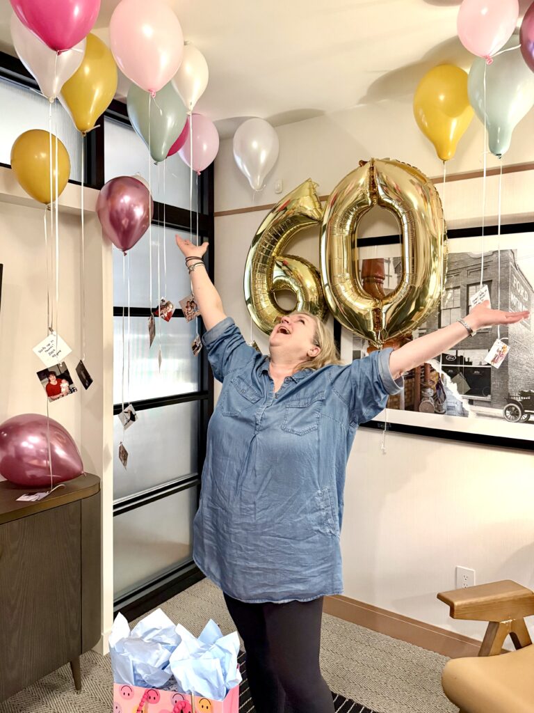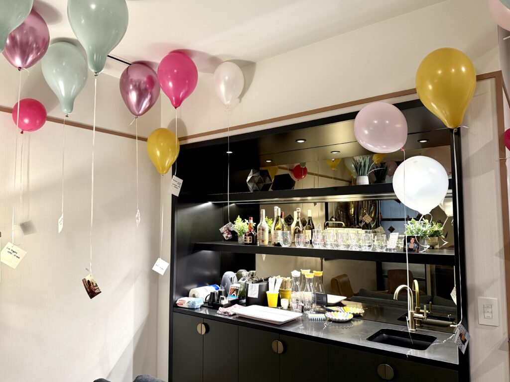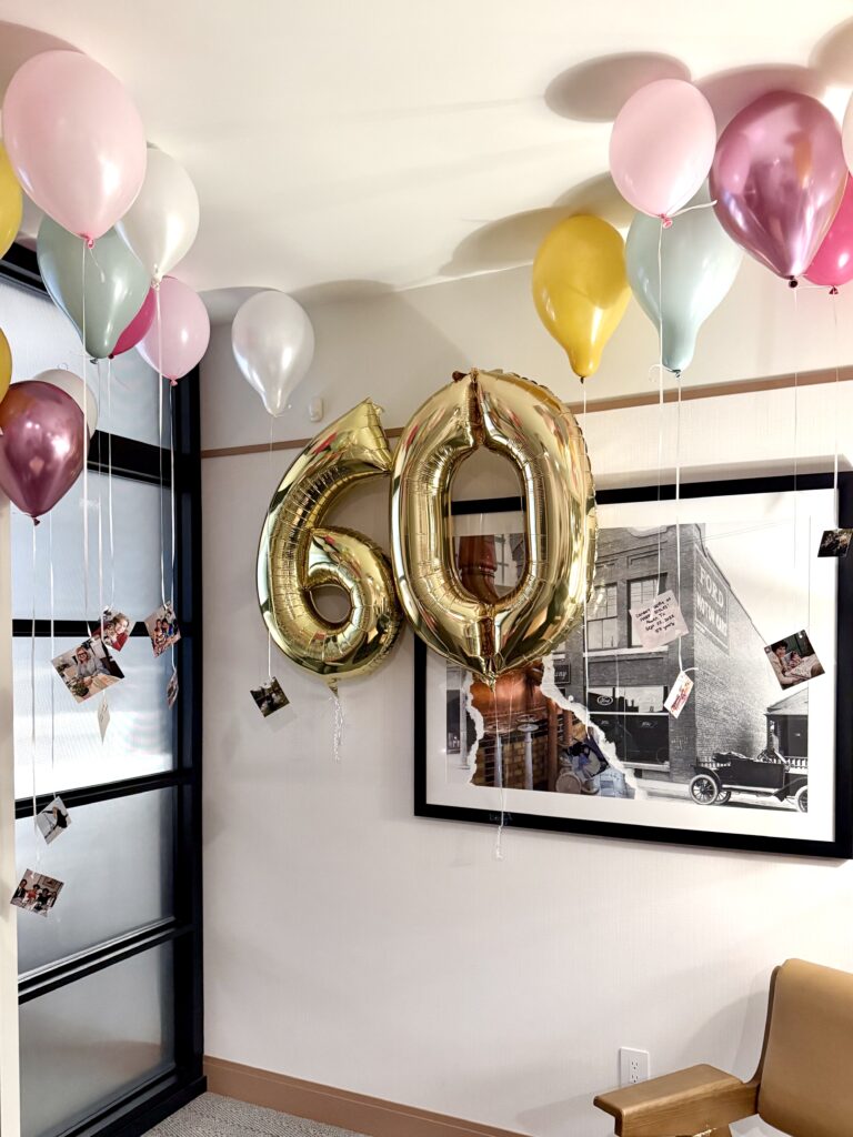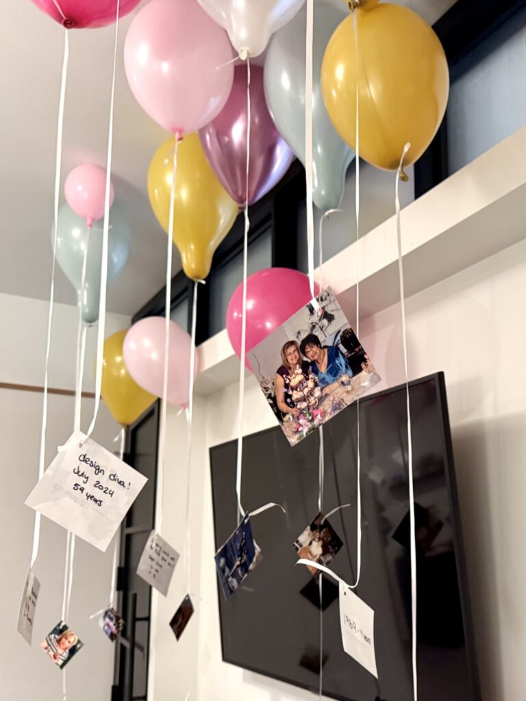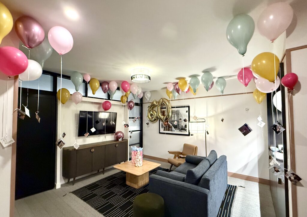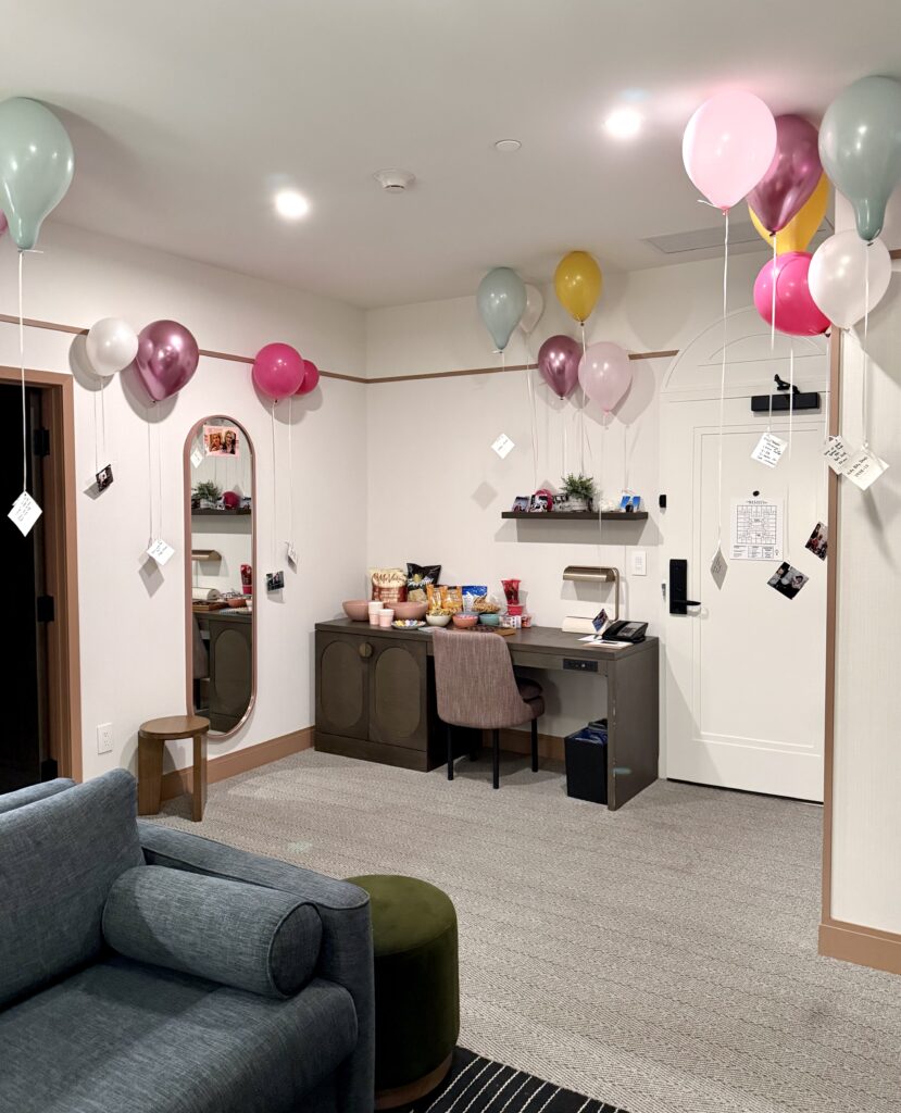 My mom had been spending the summer scanning old family photos to make digital copies, so I saw photos I had never seen before! Photos of my mom, my uncle, some relatives I’ve never met, and my late grandparents. I truly don’t remember how this idea popped into my head, but about a week before we were leaving I thought: “what if I print out one photo from each year of my mom’s life, and hang them from balloons in the hotel room…” This was hard because my mom is basically a detective. I first had to pick 60 photos I thought represented her, things she loves, life milestones, trips, etc. Any post-digital era pics I had to stealthily email myself from her computer so I could get them printed, but also delete the sent emails so she wouldn’t find them! I took pre-digital age, already printed photos from her “binders of extra photos for scrapbooking” when she wasn’t home, and bought 60 balloons in our colour palette on an afternoon when she wasn’t with me. I also bought a gold 60 because who doesn’t love a bday number balloon?! I went to a Party City in Calgary to get the 60 inflated, and buy tanks of helium for the latex balloons I wanted to float in the room. I spent about an hour and a half in my little craft bubble: blow up balloon, tie on string, hole punch photo, tie to string, see if balloon floats. I also wrote the date and event/place on the back of each photo. And I maybe went a little extra/over board and colour-coded the decades… 1960’s pics were on pink, 70’s pics were on blue, 80’s pics were on yellow… etc. No one noticed this (even though I had made a little info card lol!!) but everyone was in awe of this set up, and couldn’t believe I found, printed and floated 60 photos! I printed and cut all the photos to 4×4″, but I think if I did this again I would do 3×3″ or 2×2″ since the 4×4″ were kind of heavy and needed a fair amount of helium in the balloon to float.