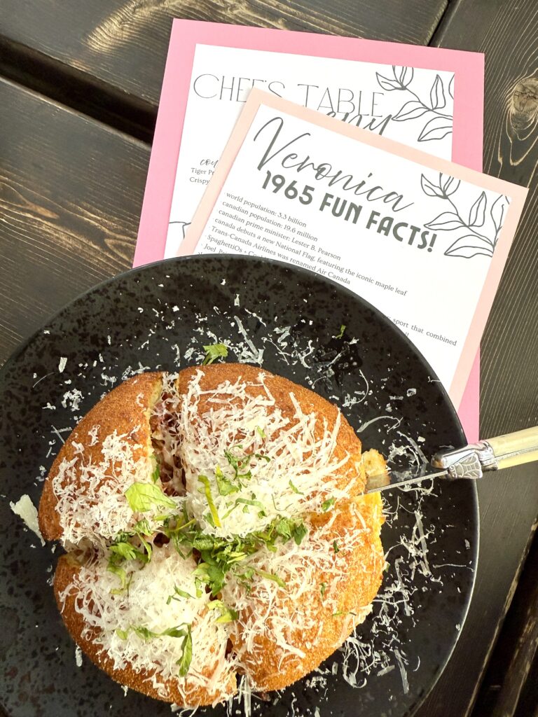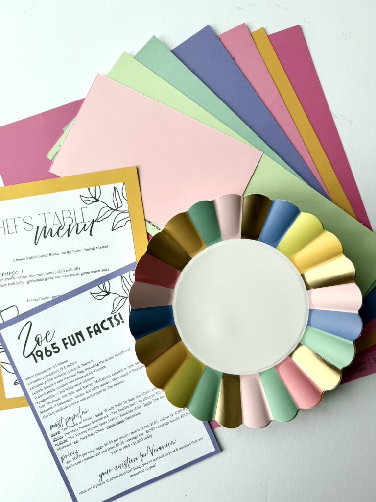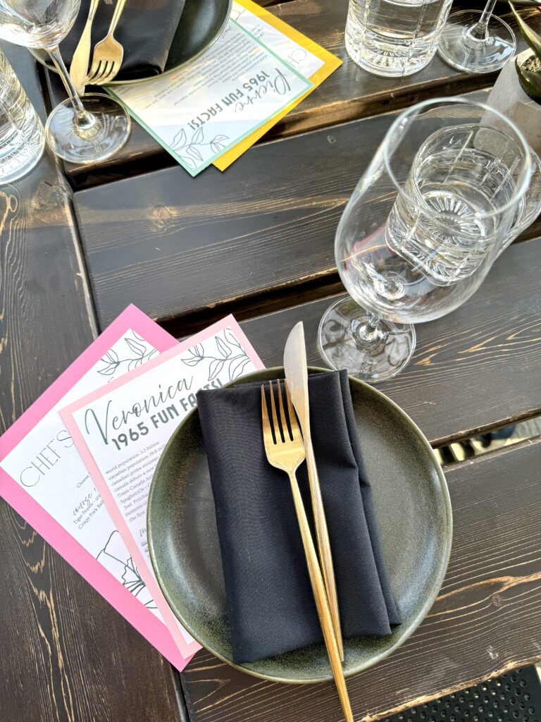 My mom chose the Orchard Restaurant for her actual bday dinner, which was such a delicious meal!! For the table I made everyone a set of dinner menus and place cards, in our colour palette, of course! For a party of 10, the restaurant does a set menu and they emailed me with the exact dishes a few days before. I personally don’t like when I don’t know what I’m eating, so I thought a printed menu for everyone would be nice! I also made everyone a name card, this was helpful for seating arrangements, and I also added some fun facts on there from 1965! We like to do “birthday questions” when we celebrate bdays, everyone asks the birthday person a question, and this has become a fun tradition! I had texted everyone 3 weeks before asking them to send me a question they’d like to ask my mom, and I added their question to the bottom of their name card. Then half-way through dinner we went around and asked her our questions! It was fun to see what everyone wanted to know, and also learn some new things about my mom!