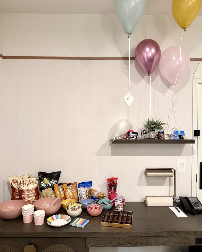Every good party needs some snacks- even though we had our dinner reso, theres nothing more fun than cocktail hour with a few snackies!! I’d like to think I know my mom pretty well at this point, so choosing her favourite snacks to stock the hotel room with wasn’t hard. We doordashed sushi to the lobby for our in-room appies, had Helluva Dip with original Miss Vickie’s potato chips, Smartfood popcorn, Synder’s cheddar bites, our fave chex mix, Haribo gummy bears, Lindt & Purdy’s chocolates, Twizzlers and Dentyne cinnamon gum.