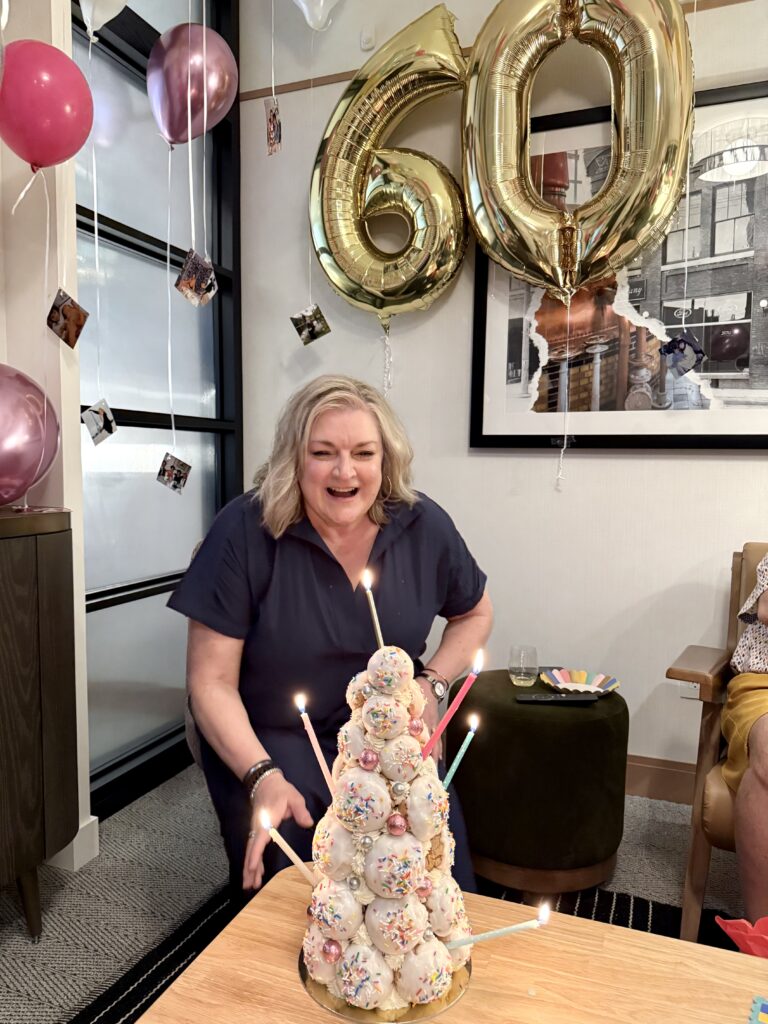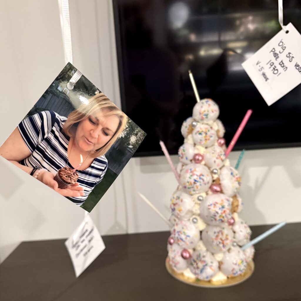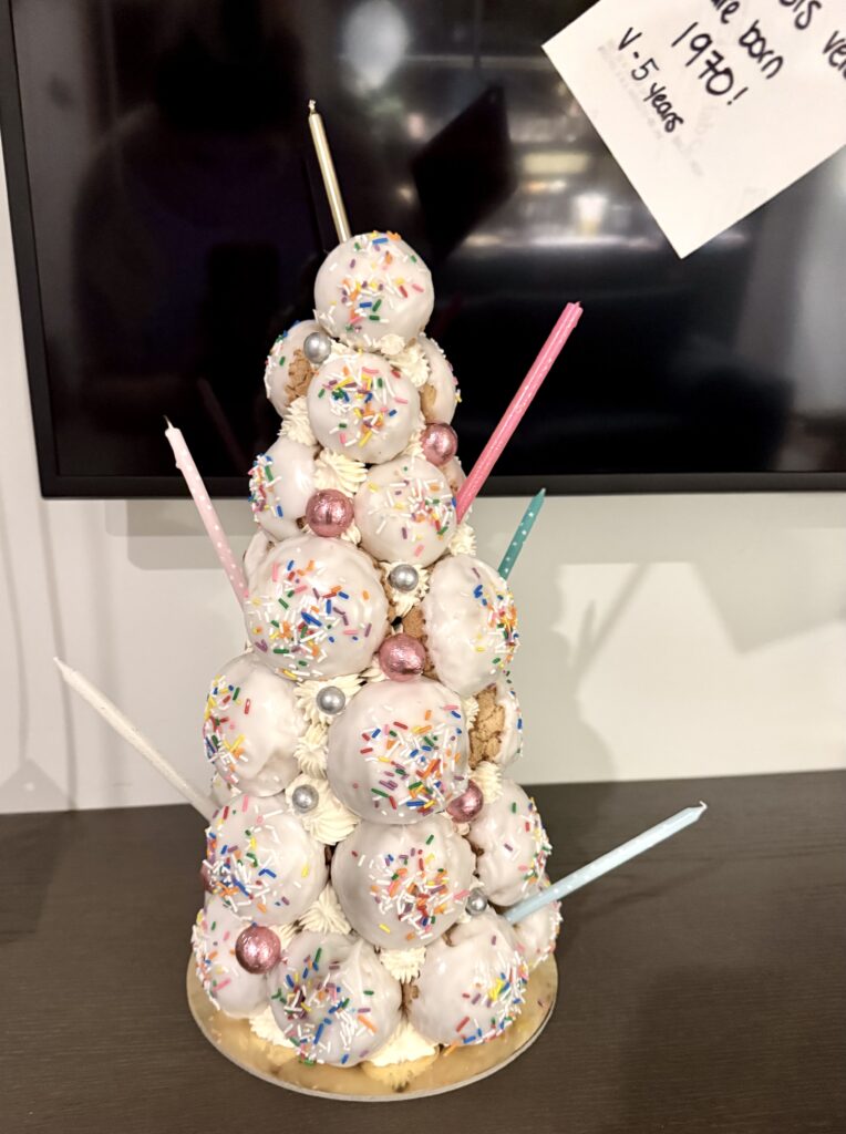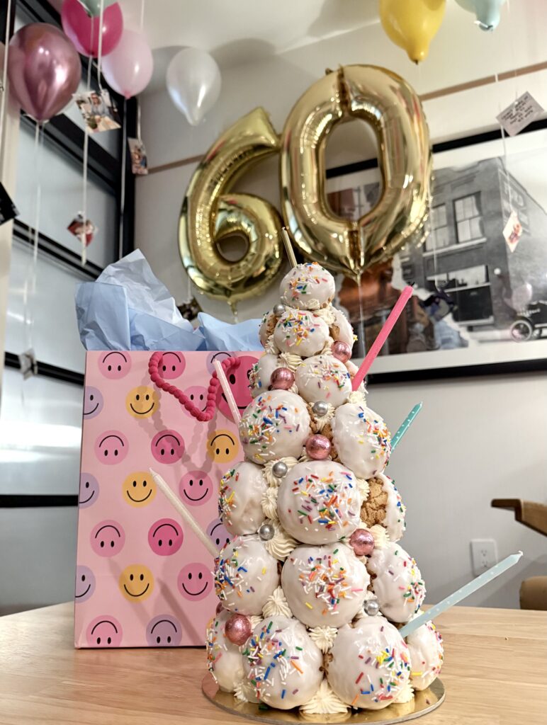Celebrating in Calgary, I knew it would be easier to order a cake/dessert from a bakery IN Calgary over buying and bringing a sweet treat from Edmonton. I had seen a viral TikTok from Creme Cream Puffs, and my mom loves cream puffs, so I went out on a limb! This was one element I was able to surprise her with. They offer a cream puff tower, so that was an easy choice! Carly was so great to work with, I chose the vanilla & sprinkle dipped puffs, with 3 filling options: salted caramel, vanilla with chocolate fudge, and lemon blue raspberry. These were a TOTAL hit, and the small 15′ tree was more than enough for all of us to enjoy and take home leftovers! I added the candles and this was her “birthday cake”!