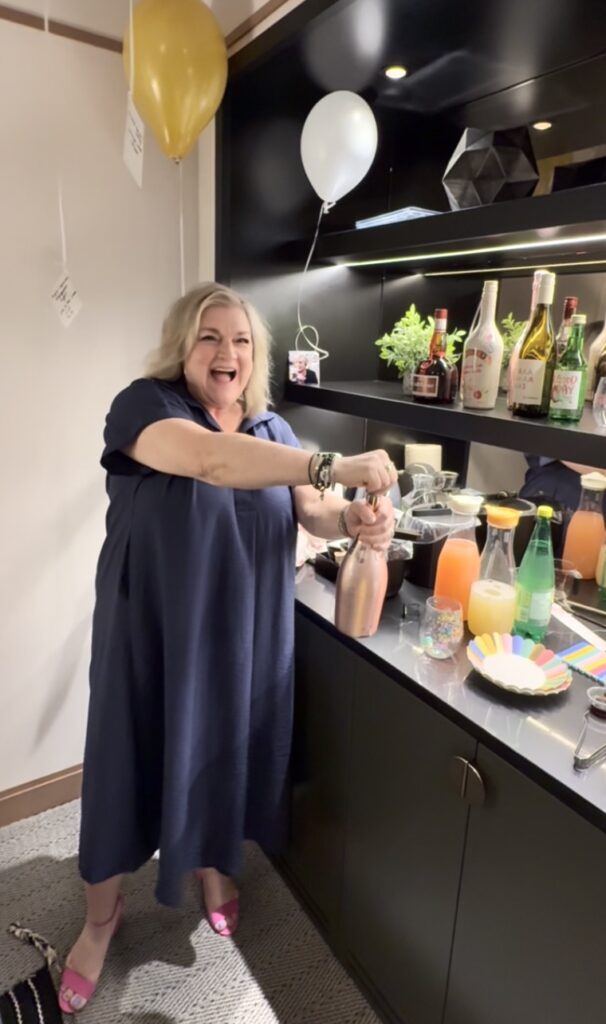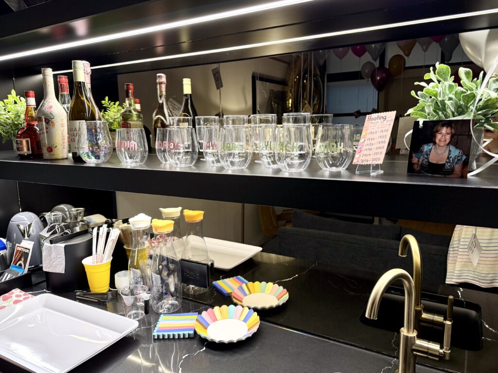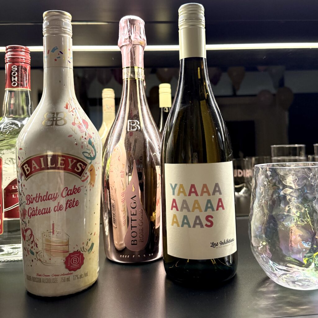 My mom wanted to be in charge of the drink options, so she brought all the ingredients and made (I repeat: she wanted to!!) a signature cocktail in the room, her “Lychee Spritz”! There was an alcoholic and non-alcoholic version of that drink, an assortment of wine, flavoured bubbly water, Diet Coke, Bailey’s Birthday Cake liqueur (this was more for the fun party vibes as it wasn’t an amazing flavour haha) and champagne! I made vinyl name stickers to put on the plastic wine glasses, so people knew who’s drink was whos! Very cute and functional, and who doesn’t love when something has their name on it?!