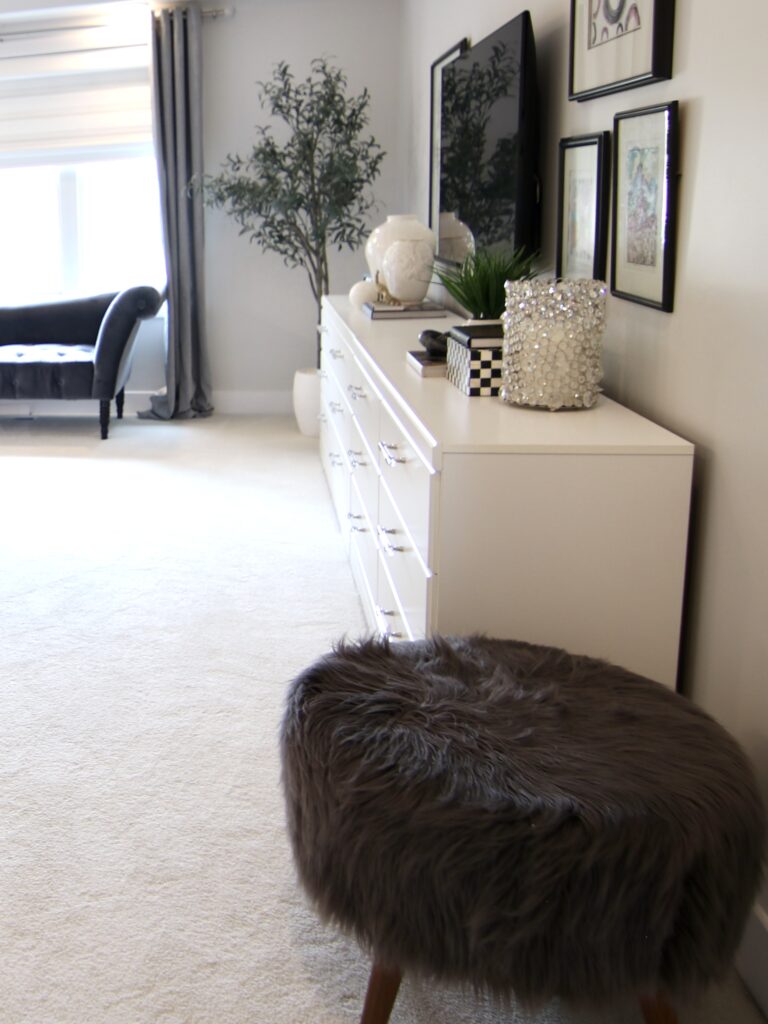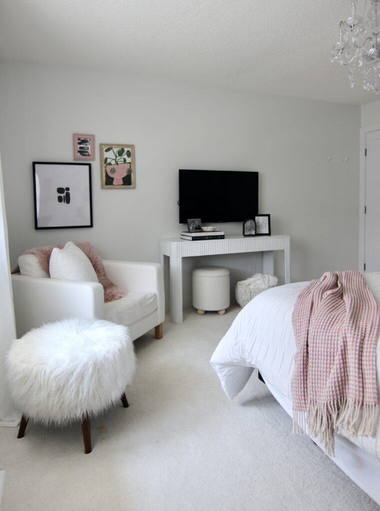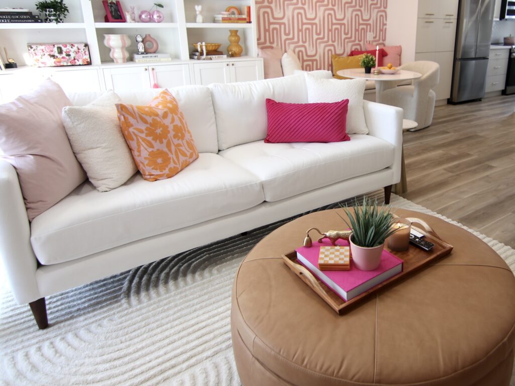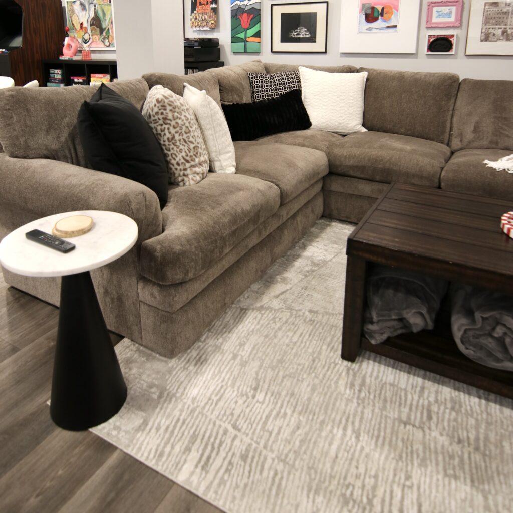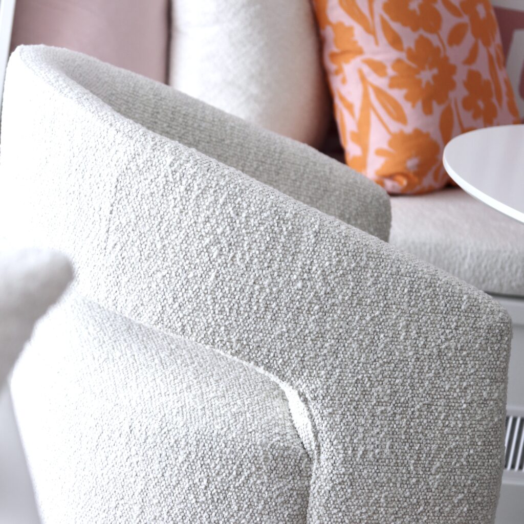 When we were shopping around for new couches for my living room and basement, Sofaland was our first stop. Claudia sat on every single couch they had in the showroom!! They are second-generation family owned and operated, offering quality furniture at an affordable price point. We can personally attest to that, as we both have Sofaland couches in our haus’s that are beyond comfy, wear super well and have a great depth (we love a deep couch esp. for napping!), all big factors for us when sofa shopping. My basement couch, the Jerome Sectional, has seen many movie nights, football game parties, sleepovers and people/dog naps! I fear my kids will fight over who gets to take it when I’m gone lol… it is a fan fave and has served our family so well since our reno! My library furniture was exactly what I wanted, sadly they no longer carry my exact ottoman or chairs, but the Mel Chair is very similar! They still have our super cute “fluffy stools”, the Jolie Ottoman, Claudia chose white for her room (at my house, now our guest room!), and I went with dark grey for our primary bedroom! Claudia bought the Dapper Sectional and Joni Storage Ottoman for her living room. The Sofaland staff have always been so friendly, knowledgable and helpful when we’ve shopped, and their product hold/delivery program is the best. We both had delays during our haus renos and both times Sofaland had no problem holding our couches, at no extra charge! They also offer home delivery, which includes building/set-up of your furniture piece which we love since big items, like couches, can be awkward to deal with!